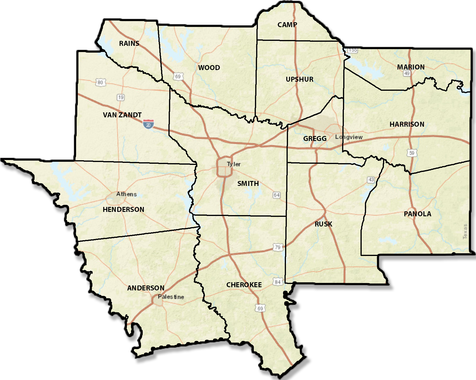 by ETCOG including Anderson, Camp, Cherokee, Gregg, Harrison, Henderson, Marion, Panola, Rains, Rusk, Smith,